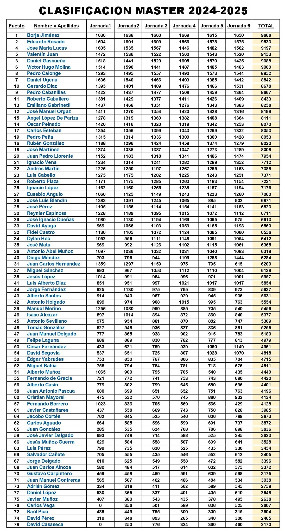 Se descuentan 30p a Adrián Gómez, y 10p a Alberto Casín, Jesús Muñoz-Guerra, Gustavo Carpintero por partidos no jugados.